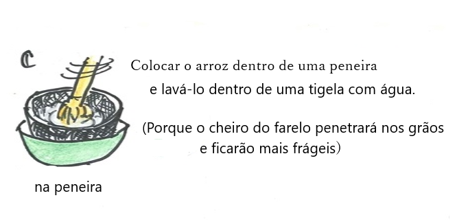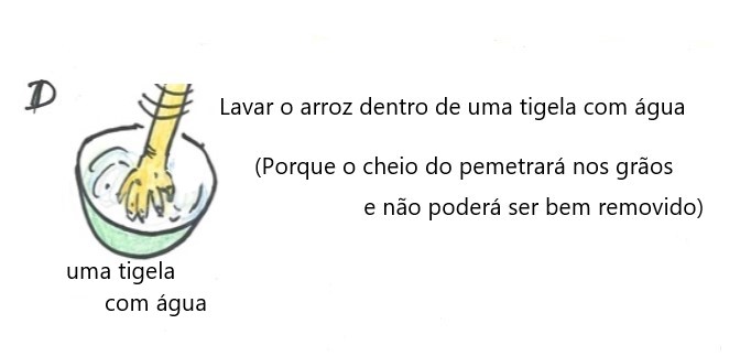 - Para lavar o arroz, prepare água em outra tigela. Depois, adicione essa água à tigela de arroz, delicadamente. Em seguida, mexa suavemente com a mão e escorra toda a água.