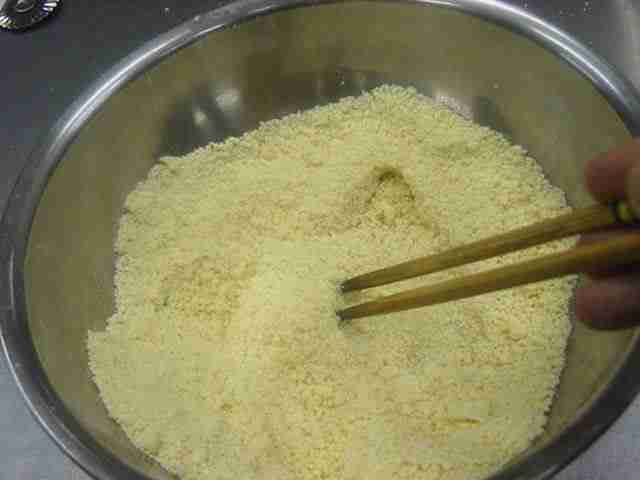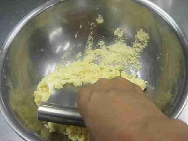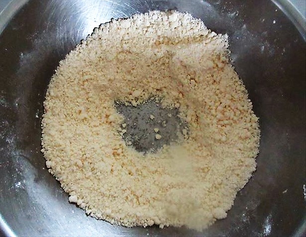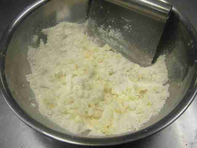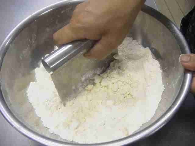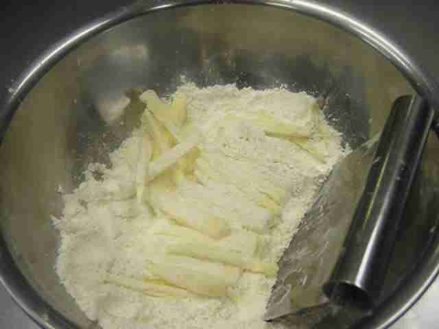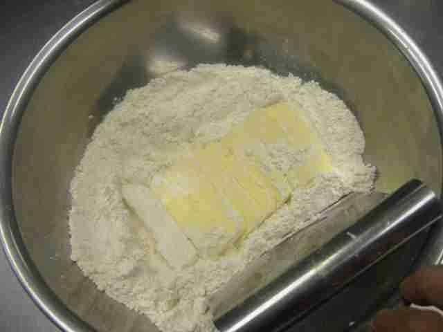 - Na vasilha com diâmetro de 24~26cm, coloque a farinha de trigo(1) e corte a manteiga em pedaços bem pequenos(2).