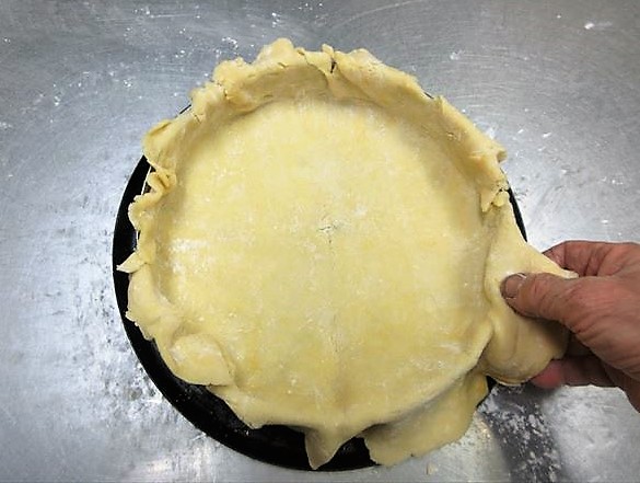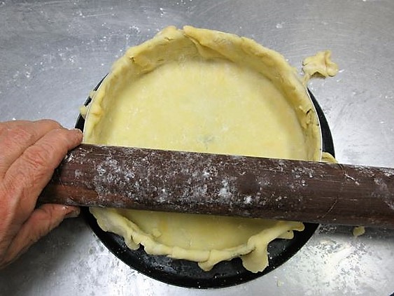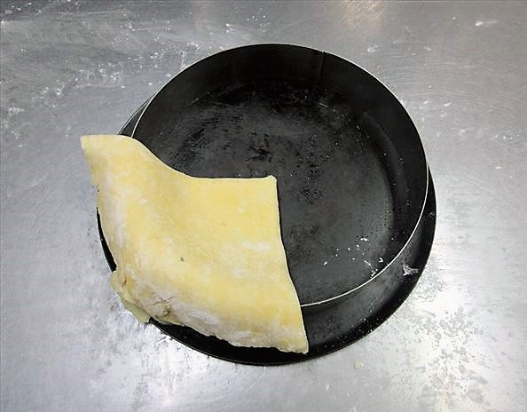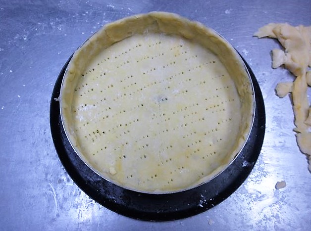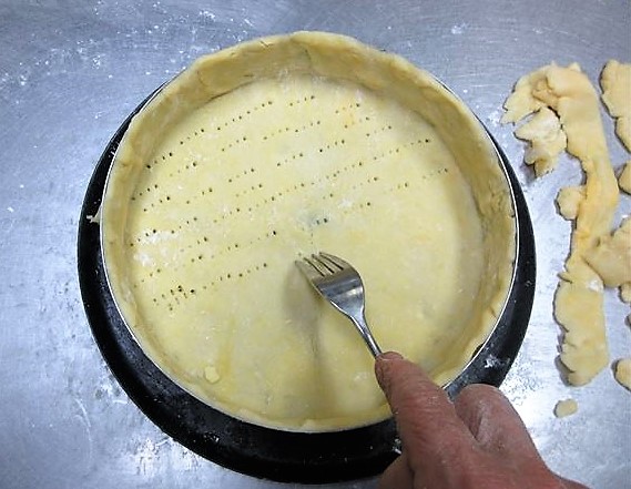 - Estique a massa na espessura de 3mm com pau de macarrão(1) e estique ao ponto da altura ser maior do que a forma (2) e coloque a massa na forma (3)、depois ajuste a massa para fora da forma com pau de macarrão(4). Faça furinhos na massa com um garfo(5).