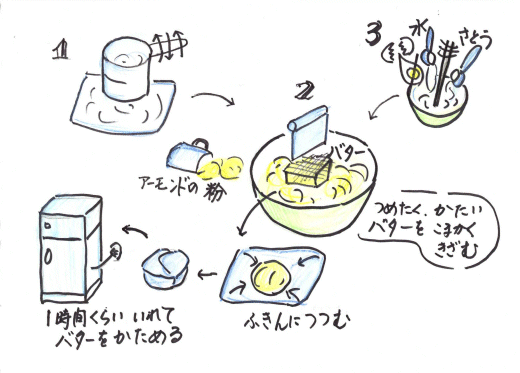 - 練りパイ生地は、小麦粉の半量のバターを刻んで作ることが多いのですが、初めて作る場合はバターを減らして、アーモンドのような油分を多く含む木の実の粉末を使うと扱いやすく、パイ作りが楽しくなります。