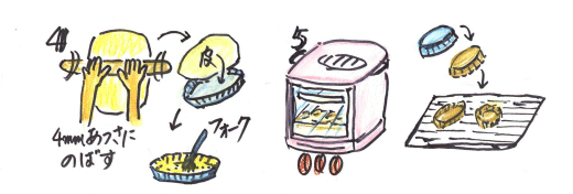 - 3を4mm厚さにのばし、タルトレットの型に入れ、フォークで空気穴をあける。