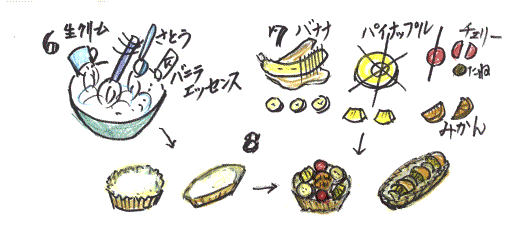 《タルトレットの皮》 薄力粉 120g アーモンドの粉 30g バター 40g ◎A 卵 1/2コ 砂糖 大さじ2 水 大 《クレームシャンティリー》 生クリーム 1/2カップ 砂糖 大さじ3 バニラエッセンス 少し 《デコレーションのフルーツ》 バナナ、パイナップル チェリー、みかんなど