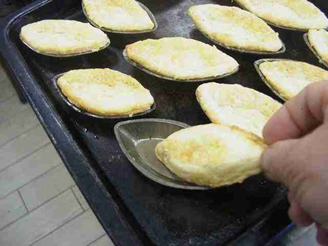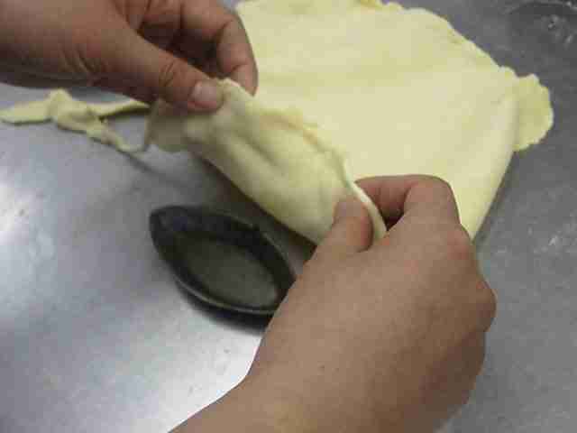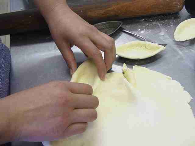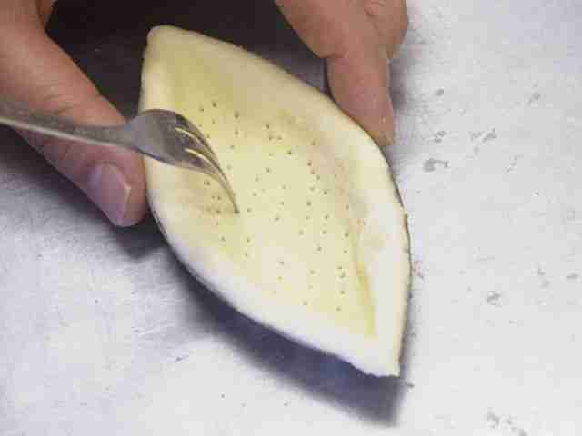 - 3mm厚さにのばし、ボート型にはめ、フォークで空気穴をあける。