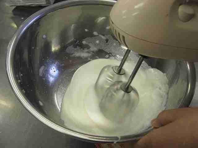 - 卵白をボールに入れ、しっかり泡立てる。