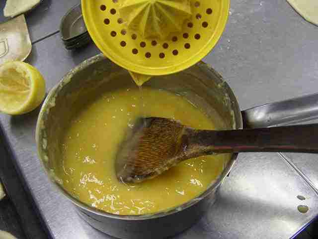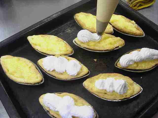- 焼けたボート型のパイに、レモンクリームを平らに詰めます。