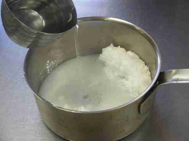- 直径15cmくらいの鍋に砂糖、コーンスターチを入れ、水と牛乳を一度に加えて、木杓子(きじゃくし)でよく混ぜます(1)。とろみをつけるのがコーンスターチなので、水分を一度に加えても、小麦粉とちがってなめらかに混ざります。