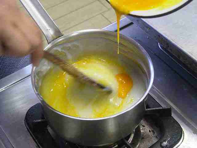 - 火からおろして、卵黄を加えて、よく混ぜる。