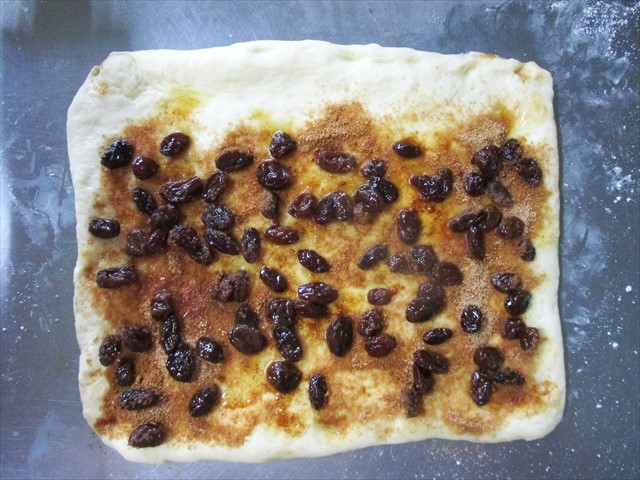 - シナモンシュガーと、ラムレーズン(ラム酒漬けのレーズン)をいっしょに巻き込んで、「シナモンレーズンロール」に仕上げてみてはどうでしょう。「ラムレーズン」でなくて、少しだけ、湯につけてからレーズンを使ってもいいでしょう。