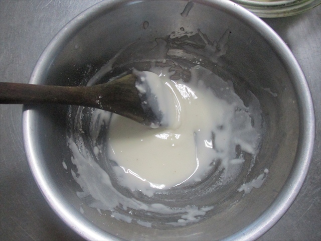 - ボールに粉砂糖を入れ、中央に卵白を置いて木杓子で粘りが出るまでよく練る。