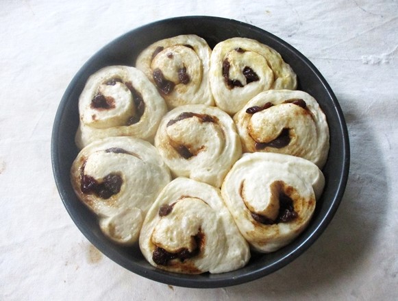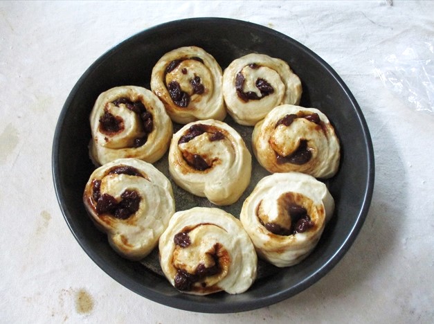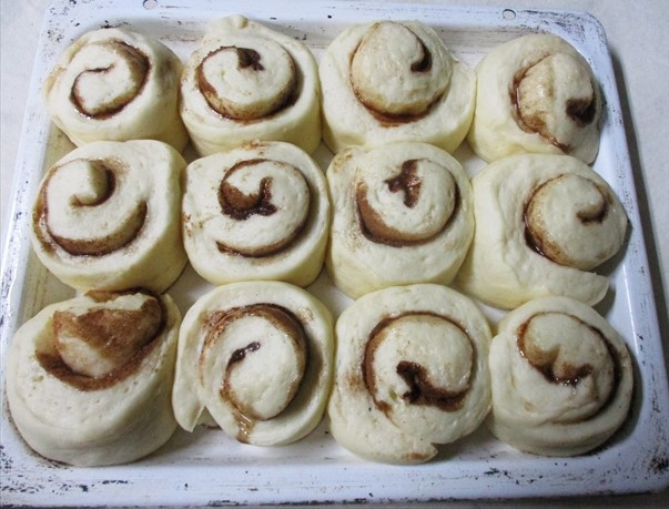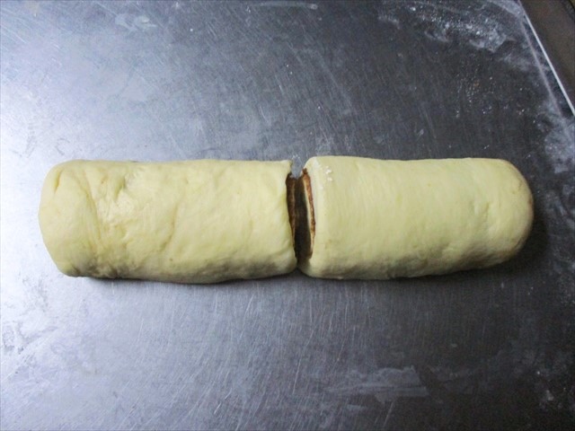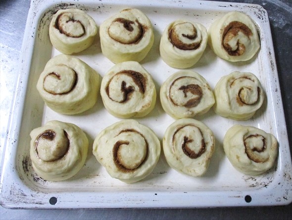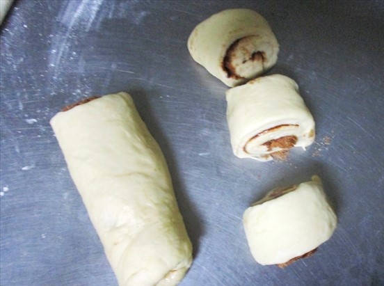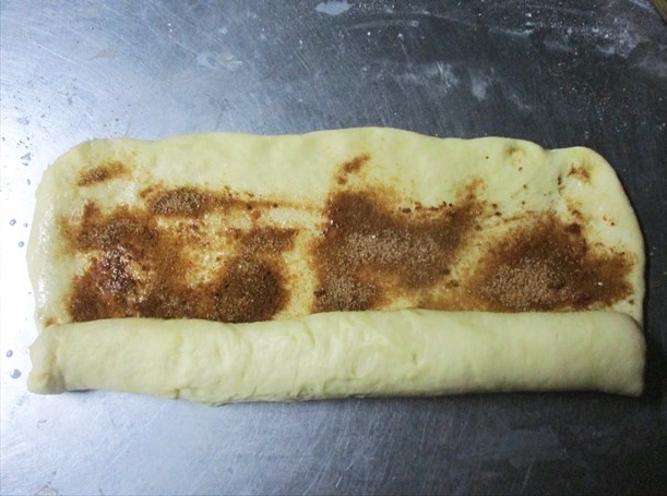 - 22×18cmの長方形に伸ばしてシナモンシュガーをふりかけて巻きます。2本巻いたら、6等分に切ります。これが「成形」です。これを型に2cm位間をあけて並べます。