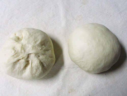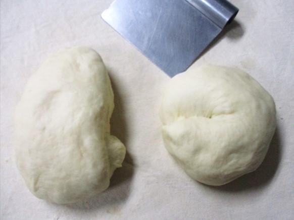 - 生地を2分割して丸めなおし、とじ目を下にする。