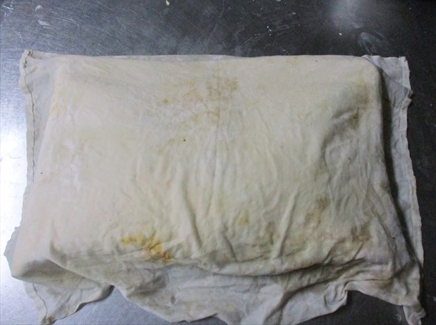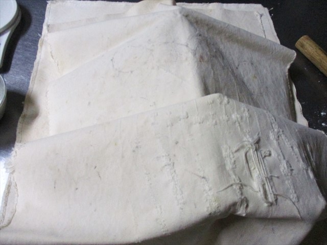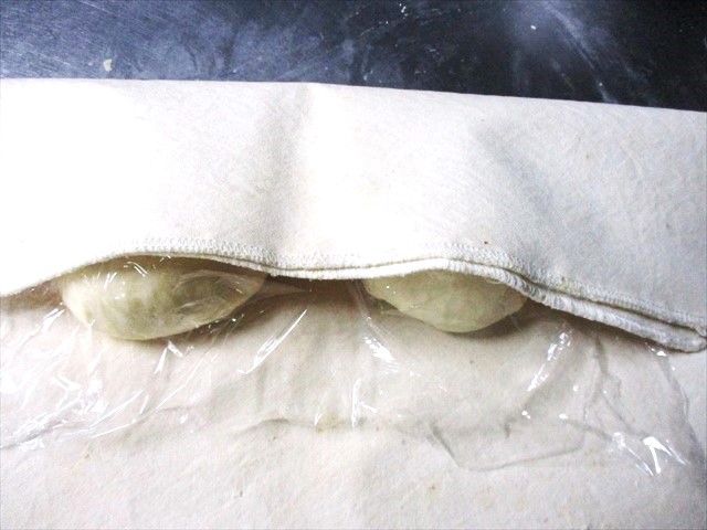 - パン生地は乾くのが大敵です。ベンチタイムではまず作業をしているキャンパス生地でおおい、そのあと、硬く縛った布巾でさらにおおっておきます。