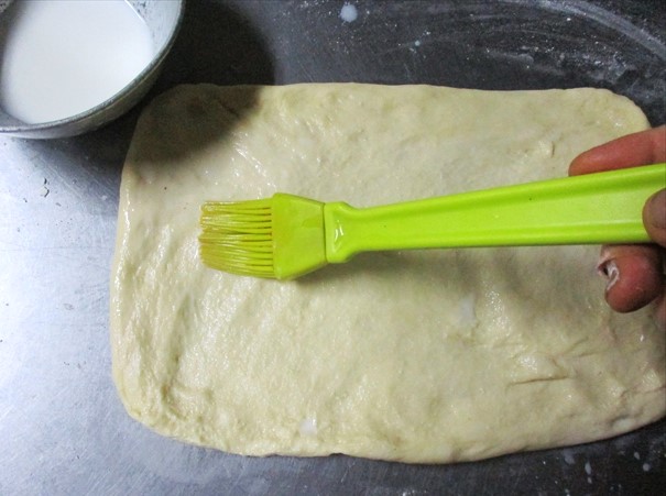 - 生地の一辺を5㎜くらい残して牛乳を刷毛で塗る。塗ってない部分を上に置く。