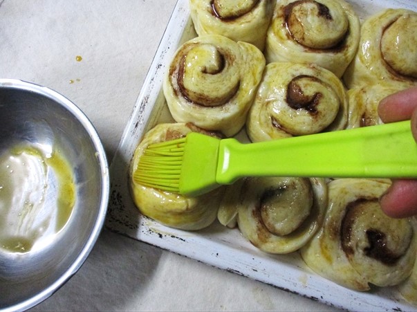 - 仕上げ発酵が終わった生地に卵を塗る。