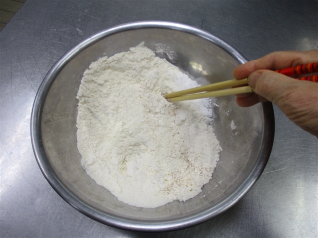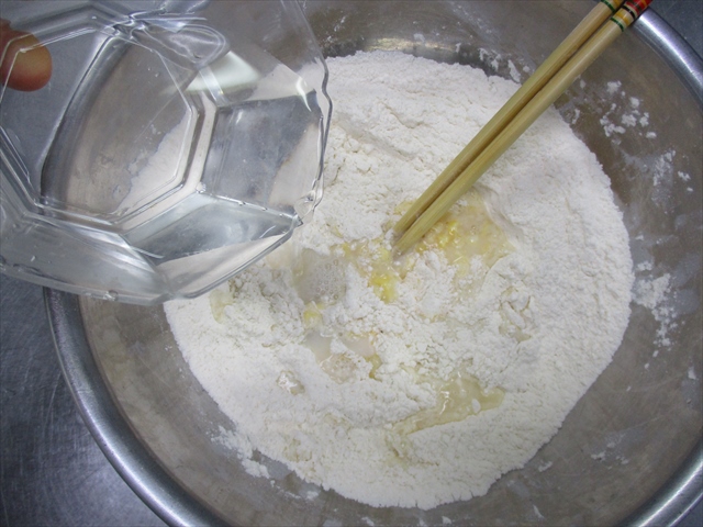 - 1にCを一気に入れて、粉っぽさがなくなるまで、ボールの中でよくこねる。