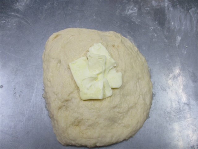 - 3が滑らかになったら、バターを包み込むようにしてねりこんで。さらによくこねる(理想の生地温28℃)