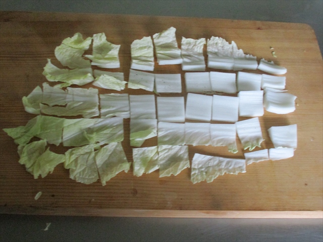 - 白菜の外側は一枚づつはがして3〜4cm角にザクザク切りにします。