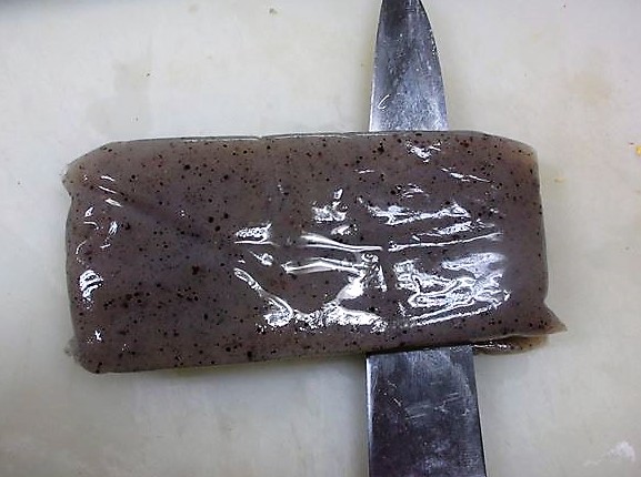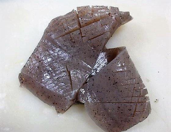 ポイントはここ こんにゃくは大きさがまちまちですから、重さを目安にしてください。厚みも決まっていませんが2~3cm弱だと思いますので、半分にします。