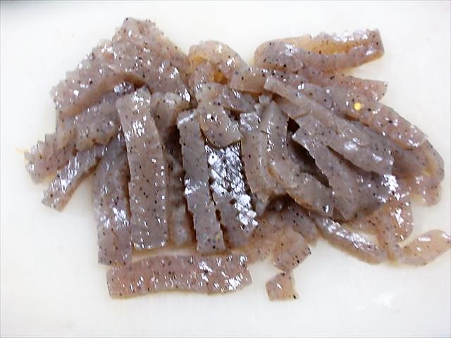 - こんにゃくは厚みを半分にして、両面に斜めに切れ目を入れ、5~6mm幅に切る。