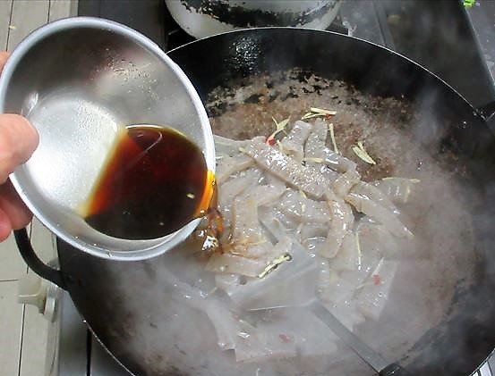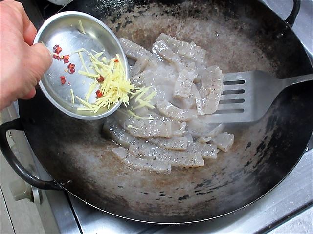 - 中華鍋またはフライパンにサラダ油を熱し、こんにゃくを炒め、油が回ったら生姜と赤唐辛子も炒め、3の調味料を加える。