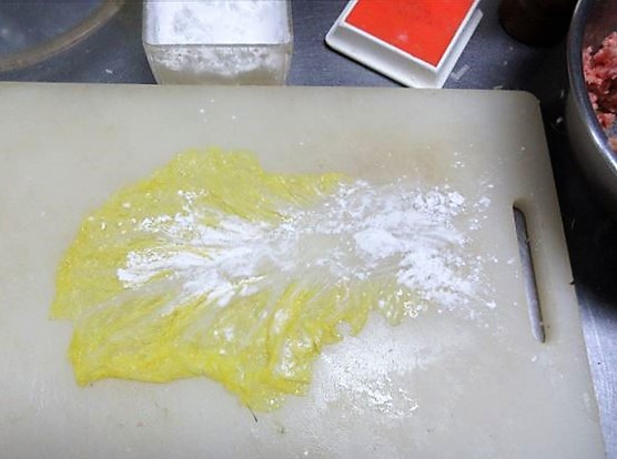 - 白菜を広げ、長かったり、厚かったりした場合は、軸の部分で調節し、片栗粉を全体に振る。