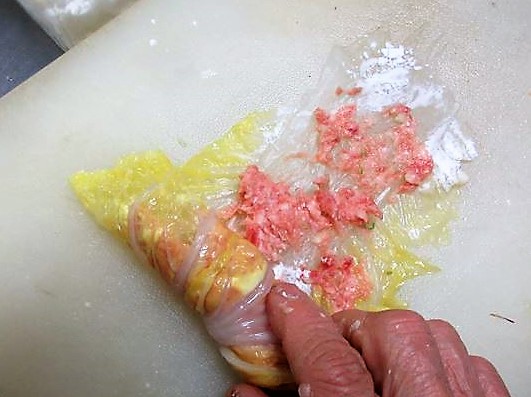 - Aの肉を白菜に平らに伸ばし、葉先からしっかりと巻く。