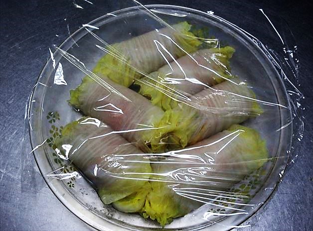 - 電子レンジに使える皿に巻き終わりが下になるように白菜の巻物を並べます。