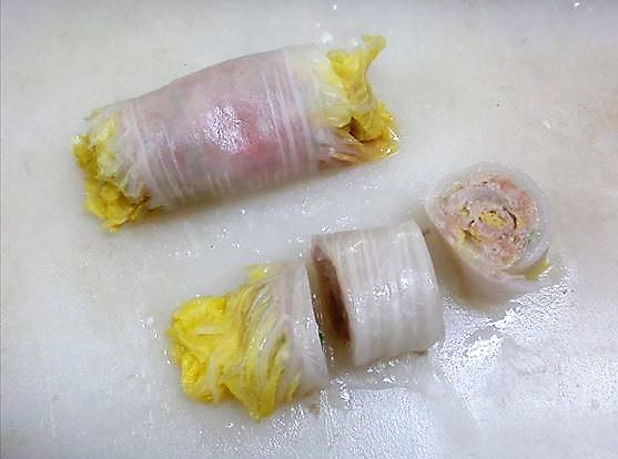 - 茹でた白菜の長さと厚みがそろうように調節は軸の部分を切ります。切った部分は「白菜の中国風おひたし」に巻き込んでしまえば無駄になりません。
