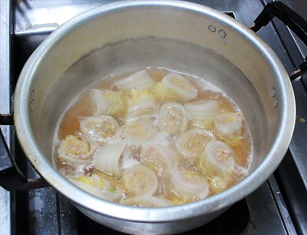 - 白菜は1枚ずつはがして茹でる。