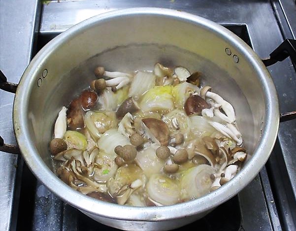 きのこを加えて煮る