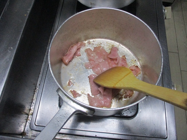 - 厚手の鍋にサラダ油を熱し、ベーコンを軽く炒める。