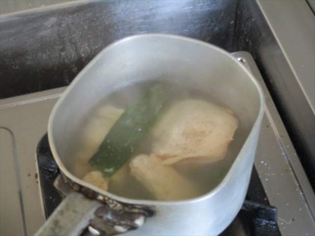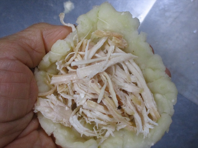 - 鶏胸肉だけでゆでてから、圧力をかけて、細くさく。