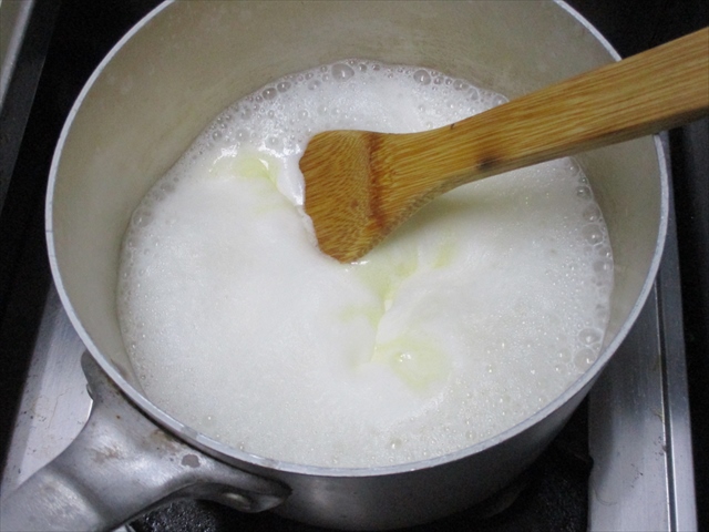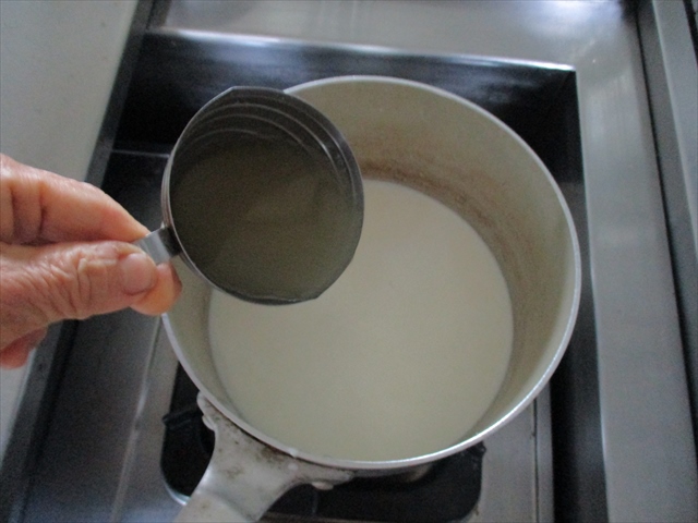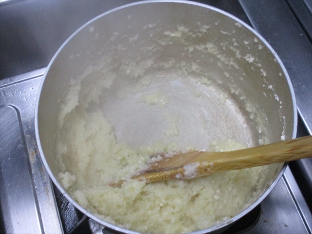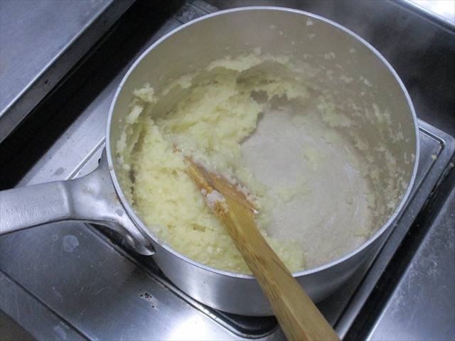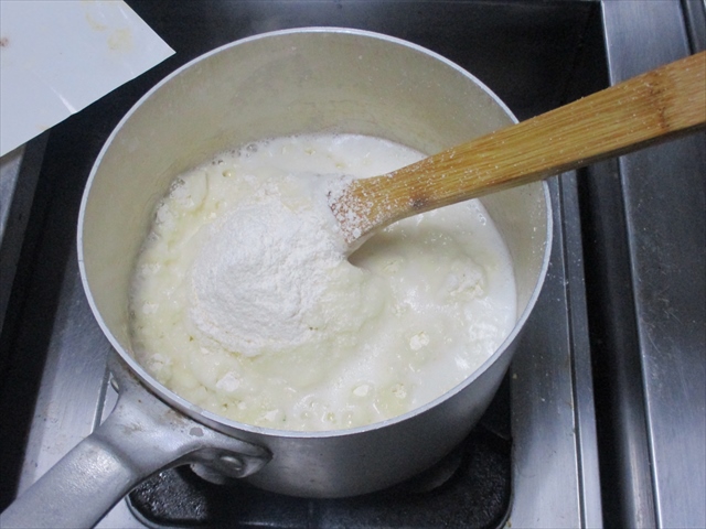 - 厚手の鍋に《A》を入れ、沸騰させ、小麦粉を入れ、鍋底の幕ができるまでよく練る。