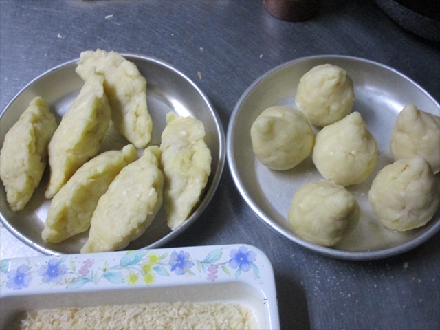 - 円形に伸ばした皮に具を入れて、一つは円錐形のように、もう一つは楕円形にととのえます。