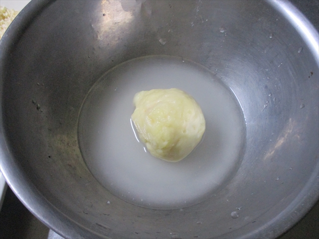 - 皮を7~8mmに丸く伸ばし、具を包む。