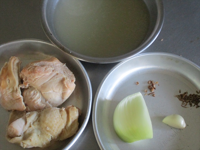 - 圧力鍋に鶏の胸肉の茹でたもの、《B》を入れて圧力を15分かけます。鶏肉を取り出し、茹で汁をこします。その汁と残りの《A》を厚手の鍋に加えます。