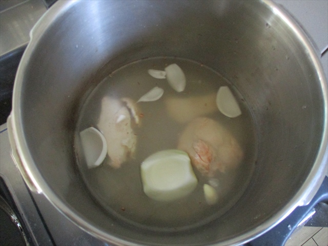 - 鶏胸肉だけを茹でたものを圧力鍋に入れる。