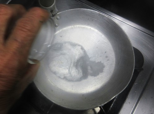 - 空の鍋を火にかけ、熱くなったら、酒を小さじ2を入れます。「ジュッ」といって、酒のアルコールが飛びます。これを「酒を煮切る」といいます。