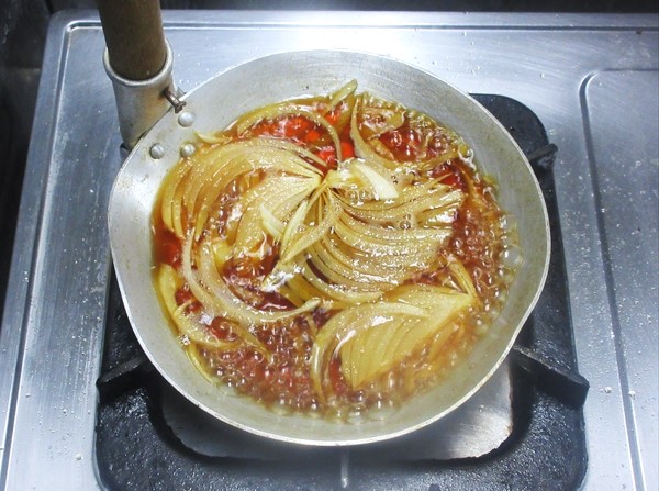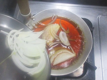 - 煮汁ができたら、玉ネギを入れ、少し透き通るくらいに煮て、トンカツを入れます。