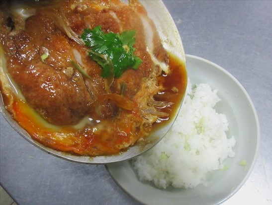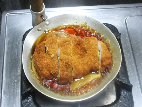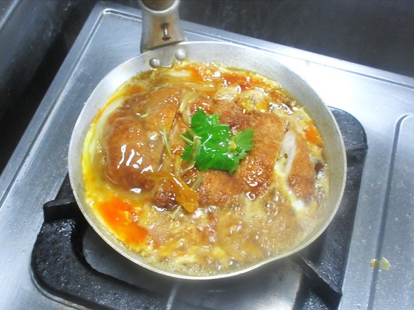 - 玉ネギが煮えたらトンカツを入れ、少し煮て、三つ葉を散らし、卵を加えて好みのかたさに煮る。