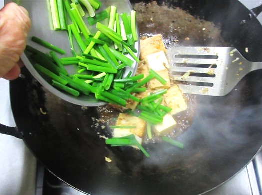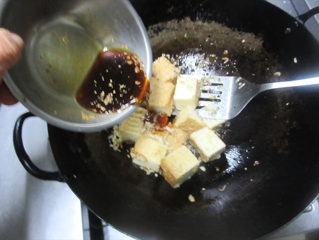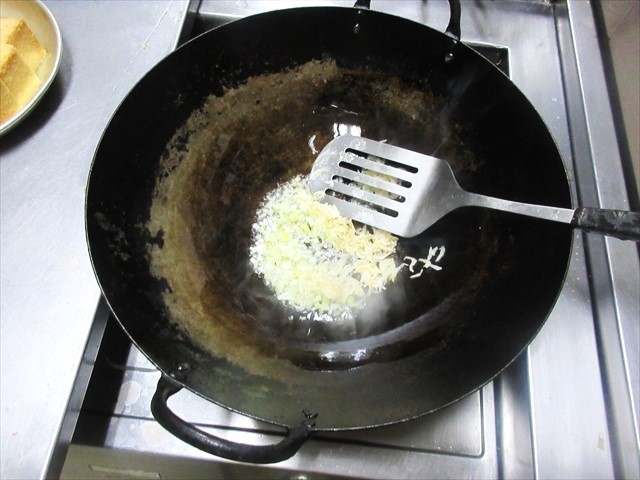 - 中華鍋にサラダ油を熱し、2,3を炒め、香りが出たら、厚揚げを入れて、くずさないように炒める。