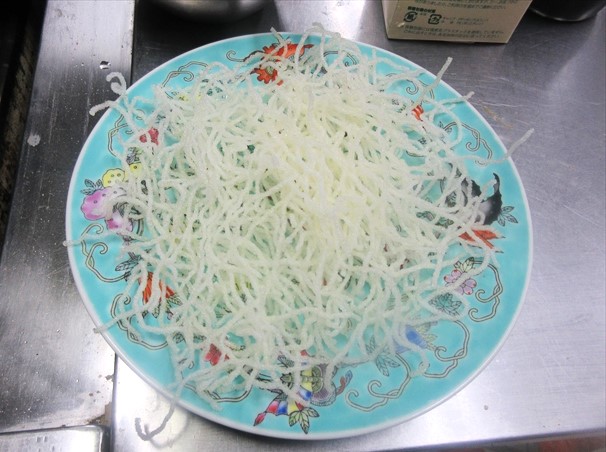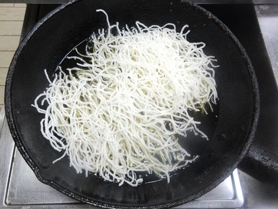 - 春雨は油で揚げて、盛り付けの皿に敷いておく。