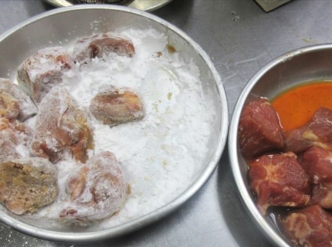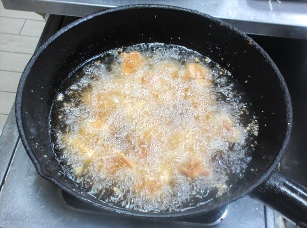 - 豚肉に片栗粉をつけて170℃の油で揚げる。
