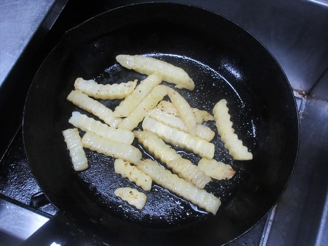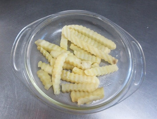 - 冷凍食品フレンチフライドポテトは凍ったまま、600Wの電子レンジに1分かけ、1のフライパンで炒め、オリーブ油、塩、胡椒をして、皿に盛る。