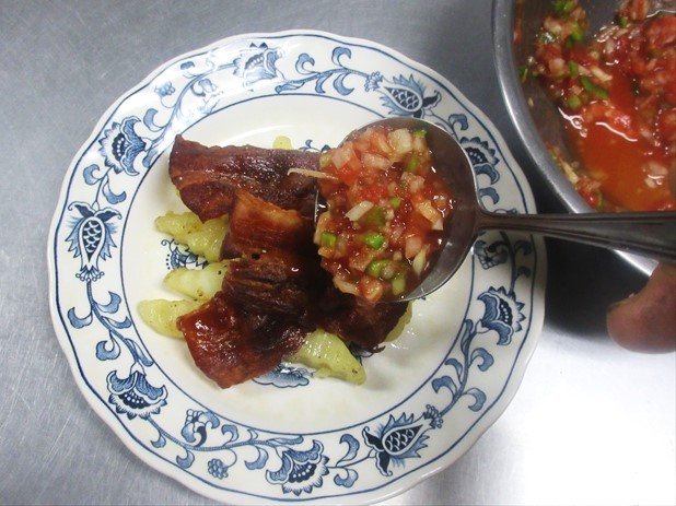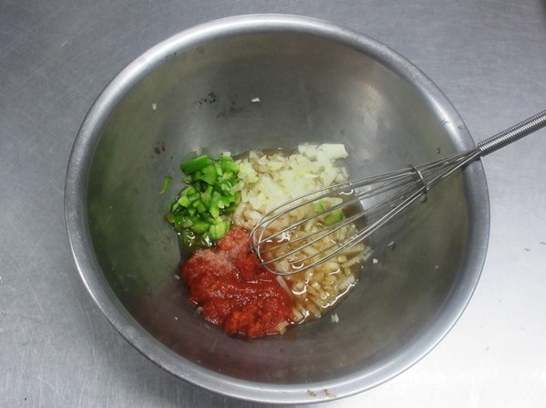 - ソースは野菜がたっぷり、色々なものにかけることができて便利です。ブラジルでは「ビナグレッチ」といって、食卓にいつもたくさん出されています。魚や肉料理に、また、サラダにもたっぷりかけていただきます。