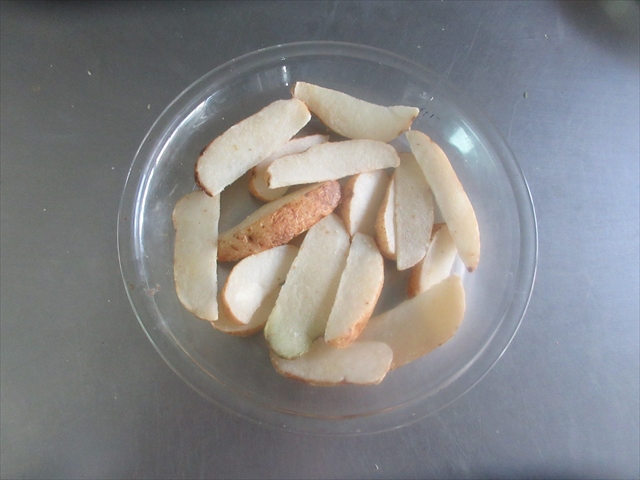 - 冷凍皮つきポテトは皿に入れ、600W電子レンジに1分ほどかける。
