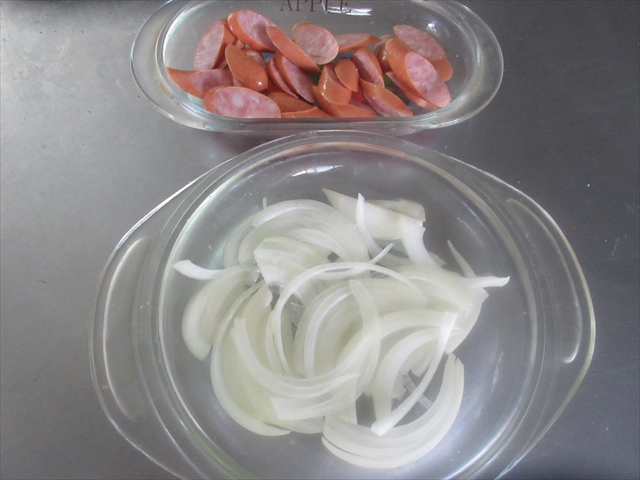 - 玉ねぎは薄切り、ソーセージは6~7mm厚さで斜めに切る。