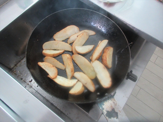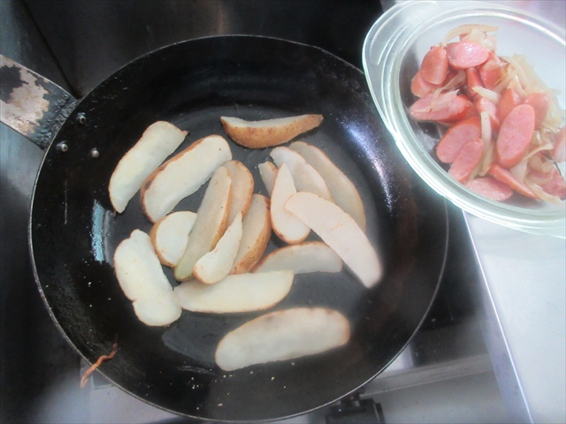 - フライパンで少し焼き色がつくくらいポテトを炒めます。