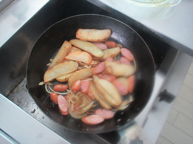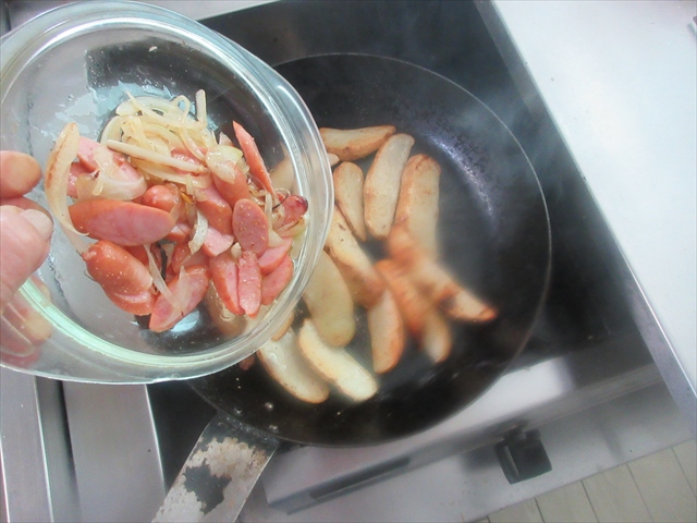 - 4に玉ねぎとソーセージを戻して、塩コショウで味付けをして仕上げる。