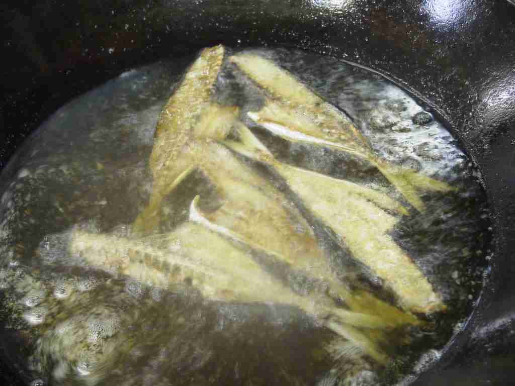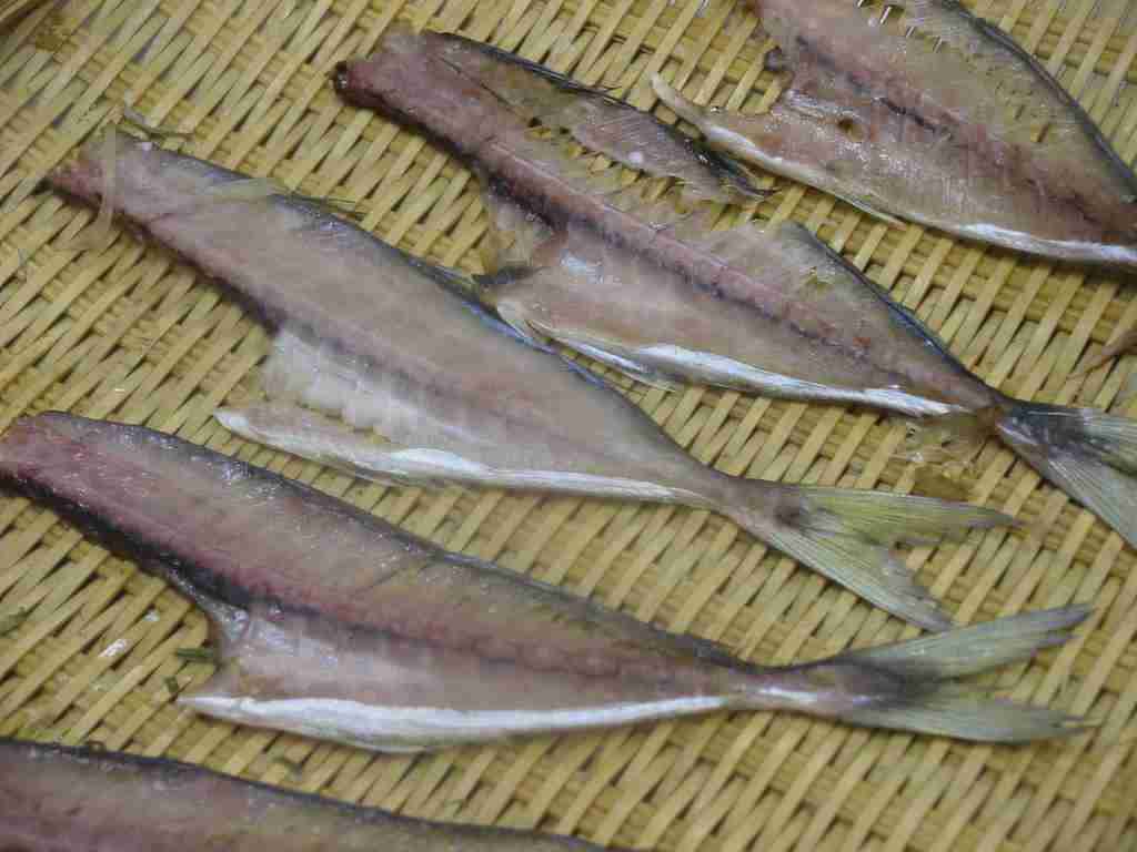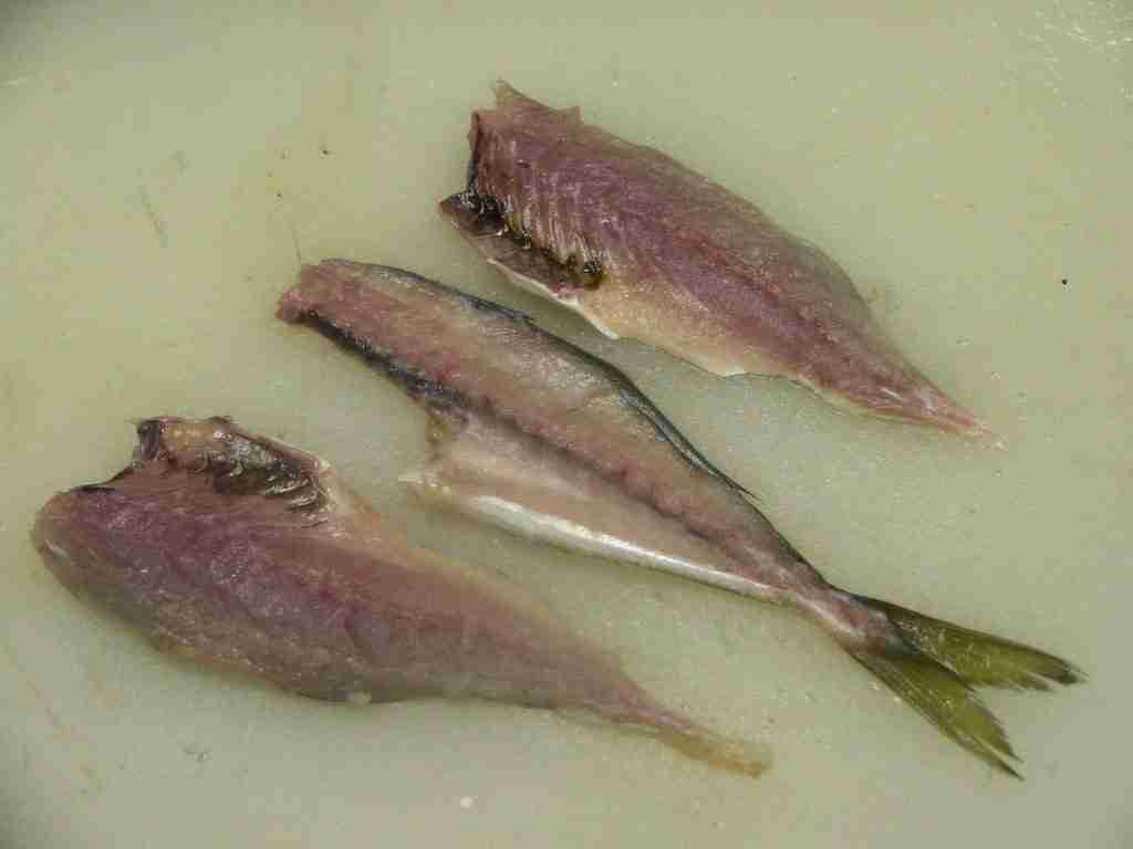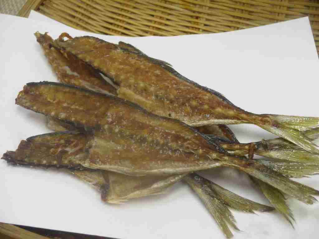 三枚卸しの真ん中・骨の部分を盆ざるにのせ、なにも上にかけずに半日から一日位冷蔵庫に入れ、乾かします。うっすら片栗粉をつけて、180℃の油でカリカリに揚げます。熱いうちに軽く塩をふります。それはまさに「骨のおせんべい」、ビールのおつまみ、子供のおやつにお勧めです。